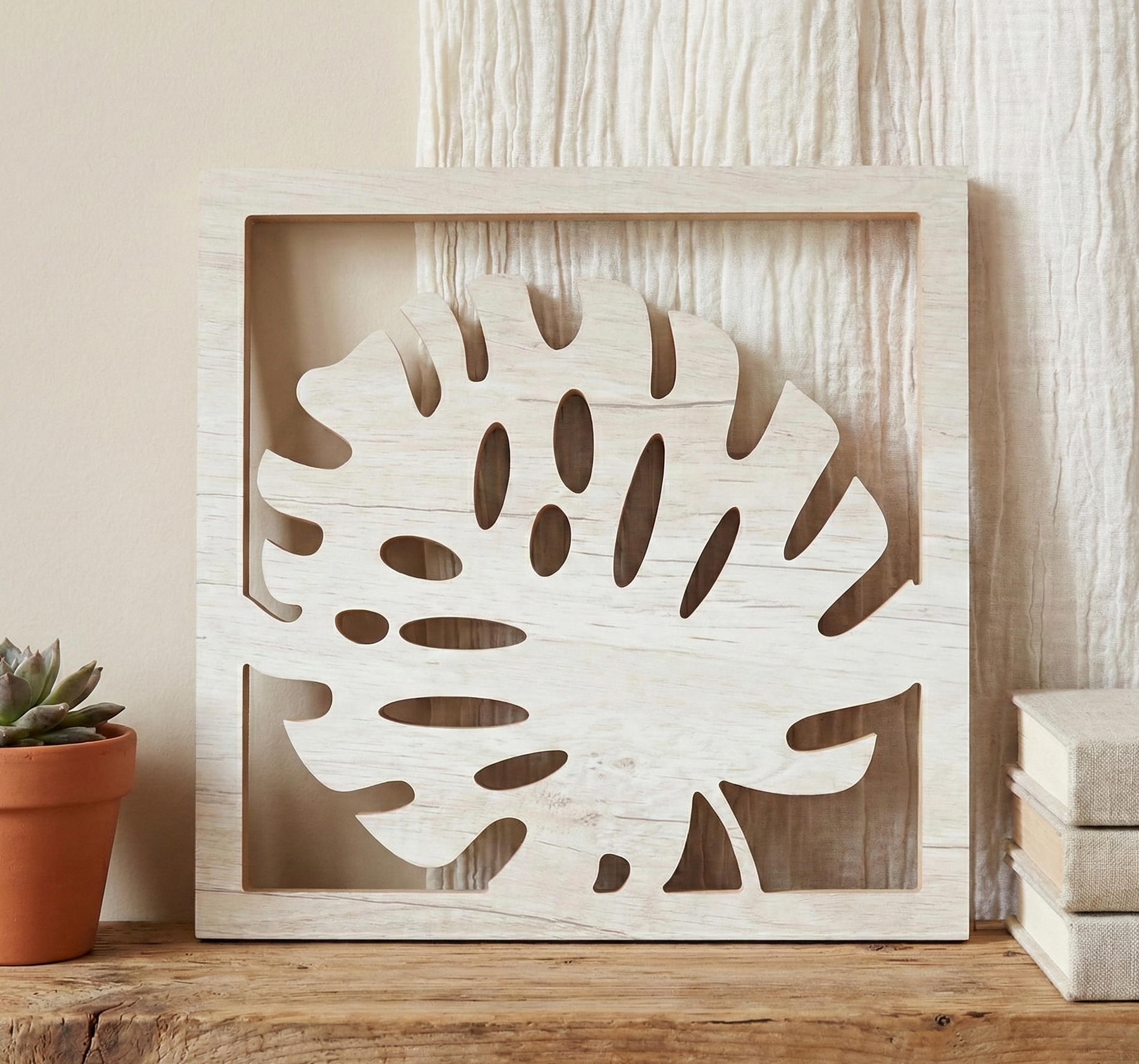 Sumá un toque natural y moderno a tus ambientes con este cuadro calado de melamina. El diseño de hoja monstera, realizado con corte CNC, aporta textura y frescura visual, ideal para combinar en composiciones botánicas o usar de forma individual.